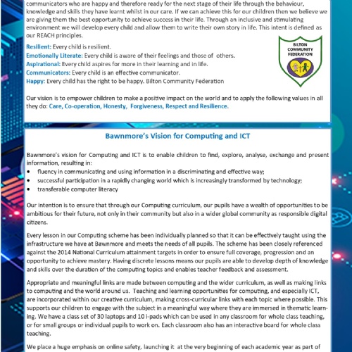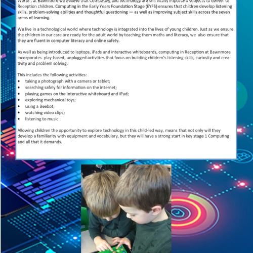 Computing is an essential skill for life in the modern world. At Bawnmore, we want children to use technology confidently, creatively, and safely. Our computing curriculum introduces key skills in coding, digital creativity, and online safety, while promoting problem-solving and logical thinking.